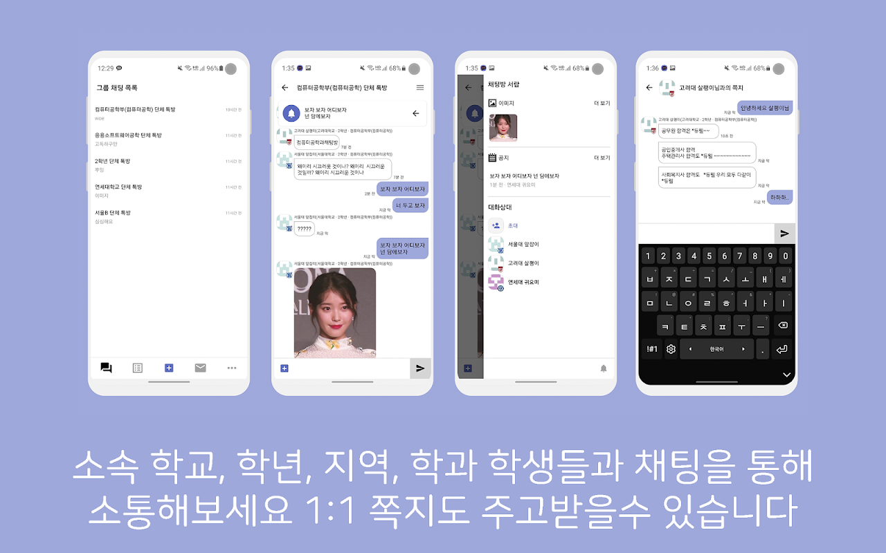 2. 소속 학교, 학년, 지역, 학과 학생들과 채팅을 통해 소통해보세요. 1:1 쪽지도 주고받 을 수 있습니다