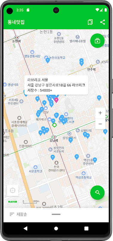 Dựa vào vị trí ghim trên bản đồ, các nhà hàng Naver được liệt kê theo thứ tự người dùng lưu và hiển thị trên bản đồ. Dễ dàng tìm thấy các nhà hàng nổi tiếng!!