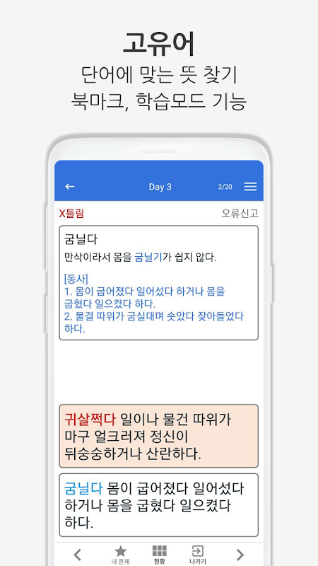 - 표준어, 외래어, 사자성어, 한자어, 고유어 어휘 학습을 할 수 있습니다.
