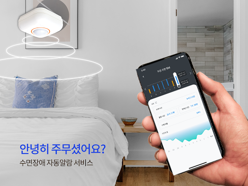 수면장애 분석 서비스 : 침실에 설치한 활동량감지기가 부모님의 수면효율을 일별/주별로 분석하여 가족 및 생활지원사가 인터넷 또는 스마트폰에 접속해서 확인해 볼 수 있습니다.