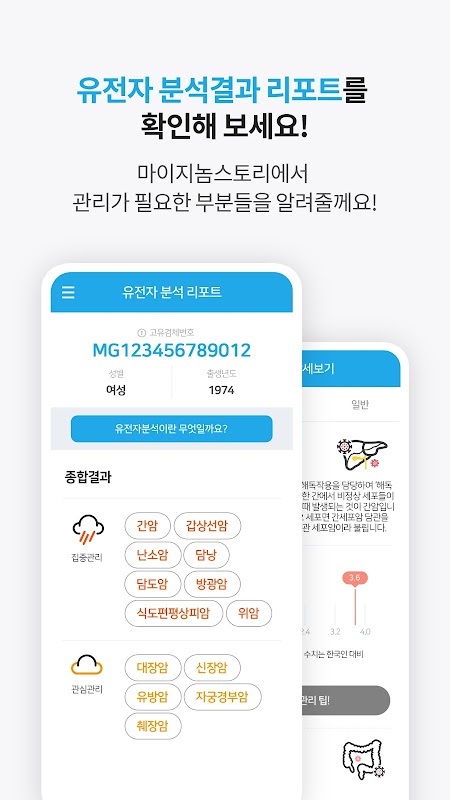 • 유전자분석결과: 유전자 분석 결과 리포트를 확인 할 수 있습니다.