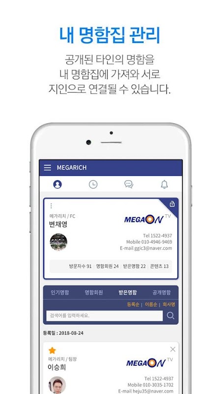 - 공개된 타인의 명함을 내 명함집에 가져와 서로 지인으로 연결될 수 있습니다.