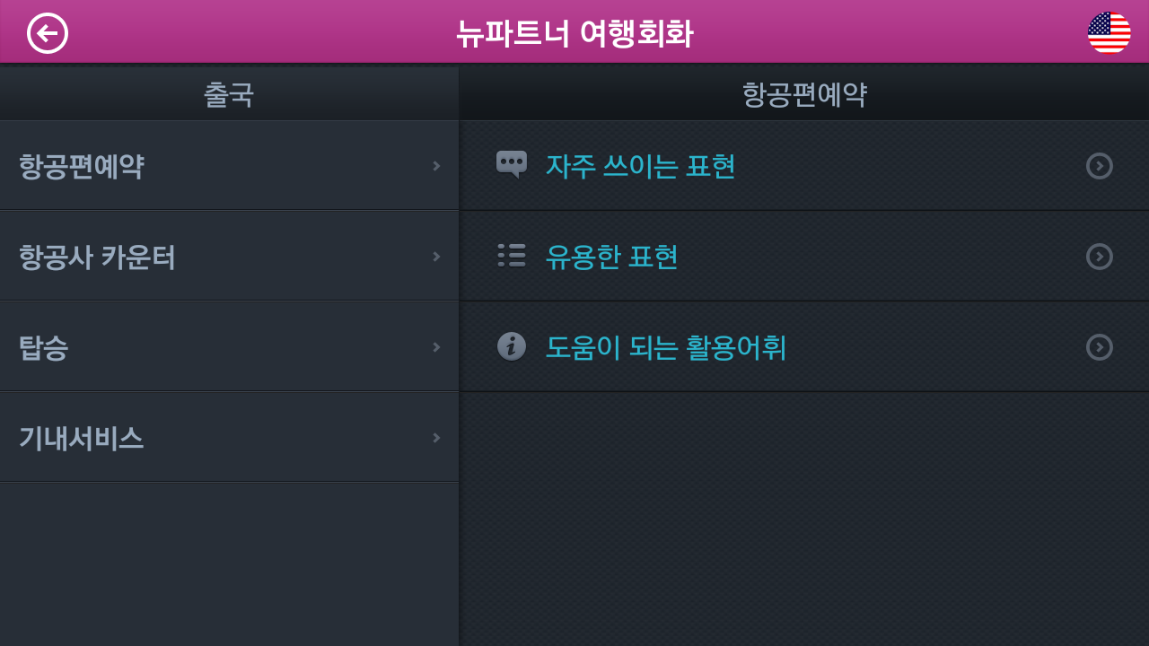 총 47개의 챕터로 이루진 "[무료]뉴파트너 여행회화"는 1000개 이상의 회화 문장과 원어민 발음을 제공합니다.