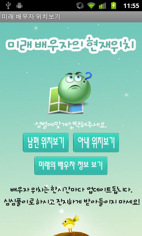 * 과학적 근거가 없는 심심풀이 어플입니다. 진지하게 받아들이시거나 미래 배우자 위치를 실제와 혼동하여 찾아가실분은 어플을 설치하지 마십시요.