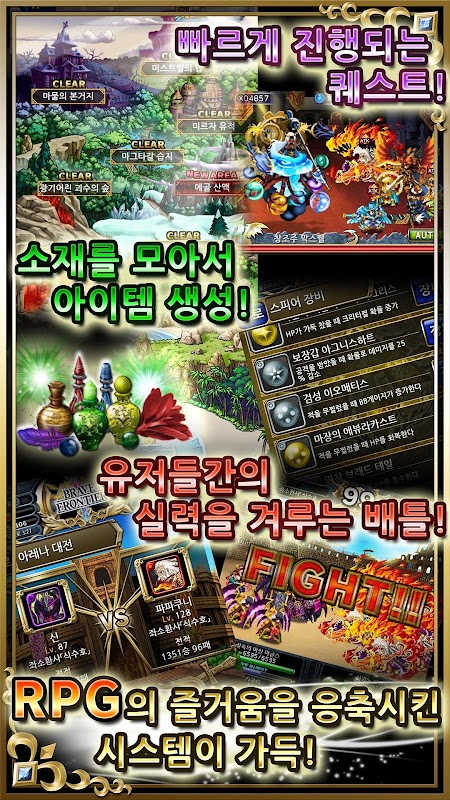 누구나 손쉬운 터치로 파파팍! 타격감 넘치는 배틀을 즐길 수 있으며, 정통RPG의 재미를 진하게 응축시킨 중독성 있는 전투시스템으로 구성되어 있습니다. 어디서도 본적 없는 멋진 전투를 즐겨보세요.