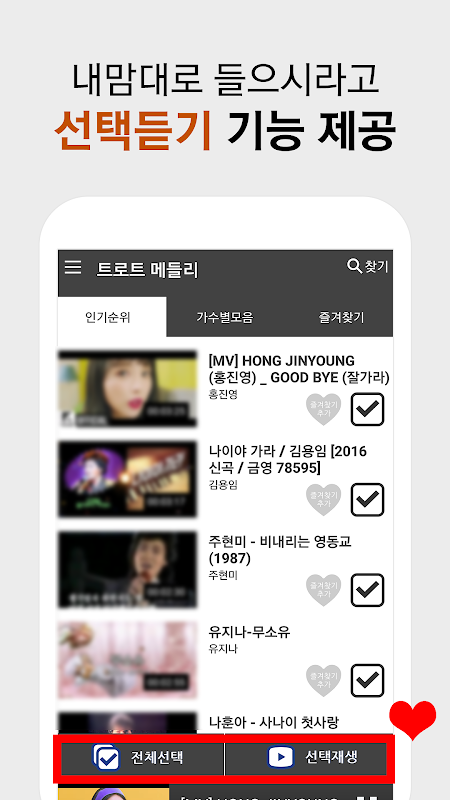 트로트 가수 히트곡부터 여러 장르의 '트로트모음'까지 손쉽게 감상 하실 수 있습니다.