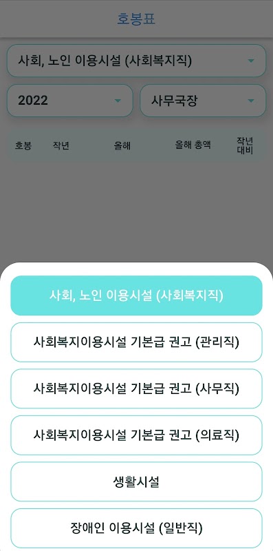 '사회복지 호봉표'앱은 사회복지기관 종사자의 호봉를 확인하실수 있습니다.