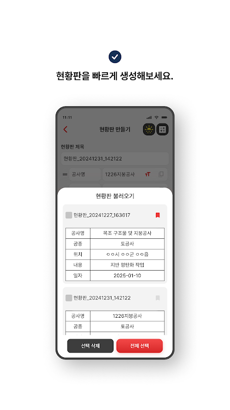 Khi chụp ảnh công trình tại công trình, tòa nhà, công trình dân dụng hoặc công trường, bạn có thể chụp ảnh bằng điện thoại thông minh mà không cần bảng riêng và tạo ngay bảng trạng thái bằng ứng dụng Bảng trạng thái công trình Seojin.