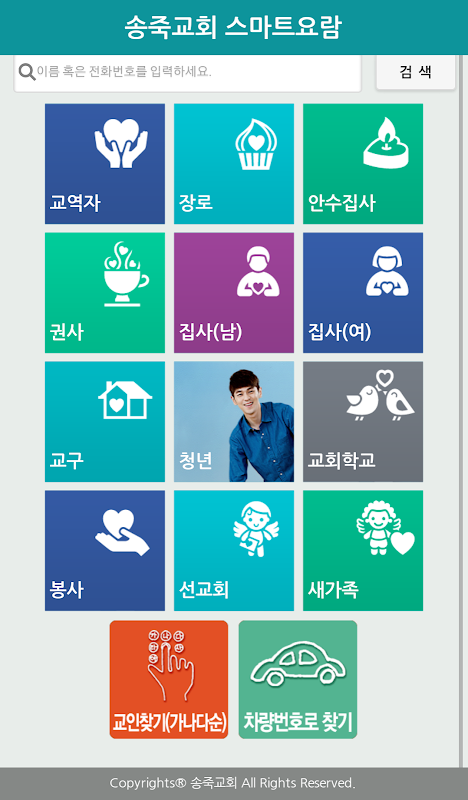 교역자, 장로, 권사, 집사 및 구역장(목자), 교사 등 모든 성도들의 요람을 스마트폰에서 확인하실 수 있는 스마트폰용 어플리케이션입니다.
