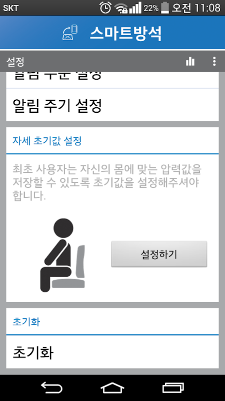 의자에 착석 시, 사용자의 신체 일부와 접촉되는 압력 센서 모듈이 장착된 스마트 방석을 스마트 기기와 연동하여 사용자의 무게 중심이 어떤 영역에 치중되어 있는지, 분산 정도를 산출하여 이미지 형태로 나타내고, 바르지 않은 자세로 일정 시간 근무를 지속하는 경우, 사용자가 바른 자세로 교정할 수 있도록 현재 자세를 토대로 자세 교정에 대한 정보를 제공합니다.