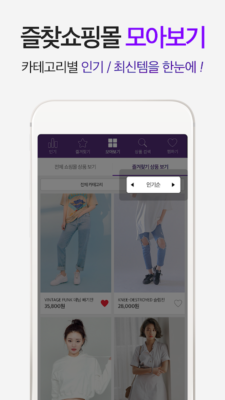 좋아하는 단골쇼핑몰을 즐겨찾기하고 생각날때마다 언제든지 방문하세요! 자주가는 쇼핑몰의 신상품이 실시간으로 업데이트 됩니다. 상품 모아보기 기능으로 더욱 편하게 쇼핑하세요.