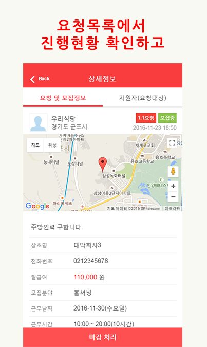 2."모집하기"를 통해 구인정보등록하면 자동 매칭을 통해 구직자에게 알림푸시전송