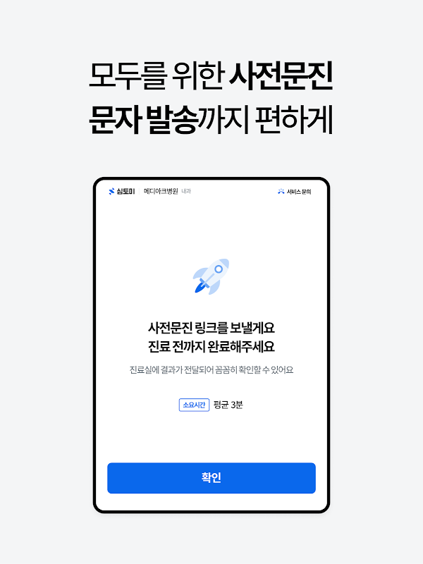 Dễ dàng hoàn thành việc thẩm vấn trước khi chờ đợi hoặc đặt lịch hẹn tại bệnh viện. Bạn có thể giảm thời gian chờ đợi và nhận được điều trị nhanh hơn, hiệu quả hơn.