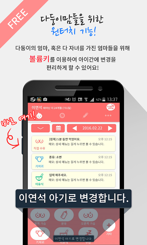 4. 다둥이와 다자녀를 위한 원터치 아기 스왑 기능(볼륨키 한번으로 기록할 아기 변경 가능)
