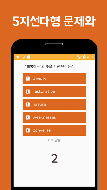 2. 중학교 영단어, 고등학교 영단어, 수능 영단어 문제를 풀어 알람을 해제할 수 있습니다.