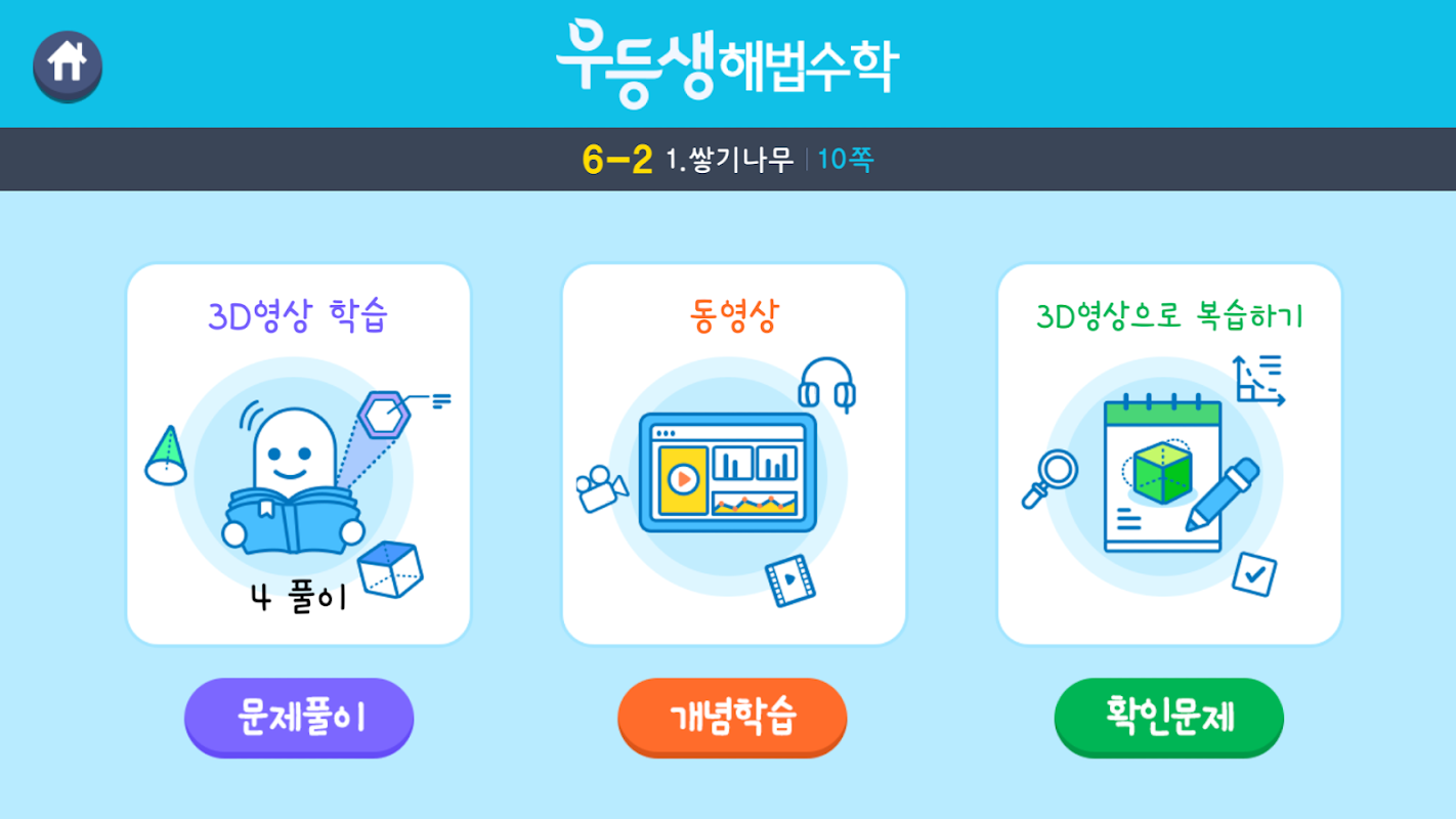 도형 영상학습은 3D 도형 문제풀이, 개념학습, 확인문제로 구성되어 있습니다.