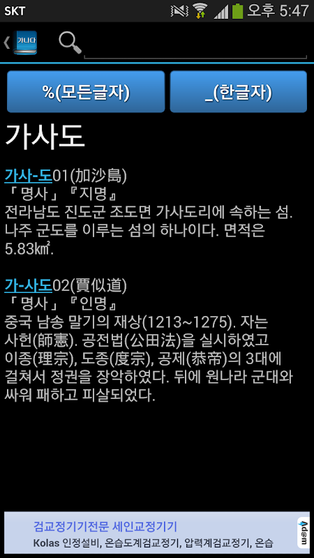 Nó là một ứng dụng có thể tìm kiếm 547,690 headwords từ từ điển tiếng Hàn bằng cách tìm kiếm từ, tìm kiếm thẻ hoang dã, tìm kiếm tiền tố, tìm kiếm trung lập, v.v. Bạn có thể sử dụng kết thúc, câu đố ô chữ, nói tiếng Anh, cải thiện vốn từ vựng, viết và viết.