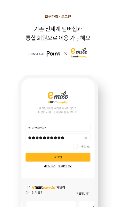 Ứng dụng E-Mart Everyday e-Mile cho phép bạn tận hưởng tiện lợi nhiều lợi ích và dịch vụ, bao gồm khuyến mãi sản phẩm, sự kiện, thông tin phiếu giảm giá, định vị cửa hàng và hóa đơn, tất cả từ điện thoại thông minh của bạn.