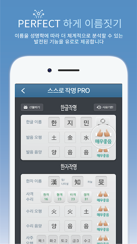 Tự đặt tên PRO là một phần mở rộng của BASIC tự đặt tên, được thiết kế để giúp cha mẹ dễ dàng tạo tên của mình hơn. Vui lòng nhập tên của Hangul mà bạn đang nghĩ đến và đánh giá xem nó có phù hợp với năm dòng và âm dương không. Sau đó, bạn có thể chọn các ký tự tiếng Trung được khuyến nghị cho tên Hangul dựa trên số lượng nét và tài nguyên. Kanji mà Nemu đề xuất (ngón tay cái, hình ảnh dấu chấm than) là một thuật ngữ kanji rất tốt. Nếu bạn không có chữ Hán được đề xuất, sẽ không có Kanji cho Hangul đáp ứng tất cả các điều kiện. Nếu bạn tìm kiếm một chữ Hán có cả hình ảnh ngón tay cái và dấu chấm than, bạn có thể nhận được kết quả tốt. Tuy nhiên, nếu bạn quyết định rằng bạn không cần phải đáp ứng tất cả các điều kiện, bạn có thể chọn các ký tự tiếng Hoa khác không được đề xuất và tạo ra các ký tự tiếng Trung tốt nhất.