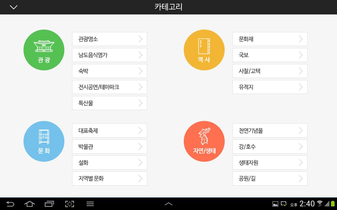 전남의 다양한 관광 문화 역사 생태에 대해서 스마트기기에서 학습 / 체험 / 정보 를 제공함 (4개카테고리, 17개 분류)