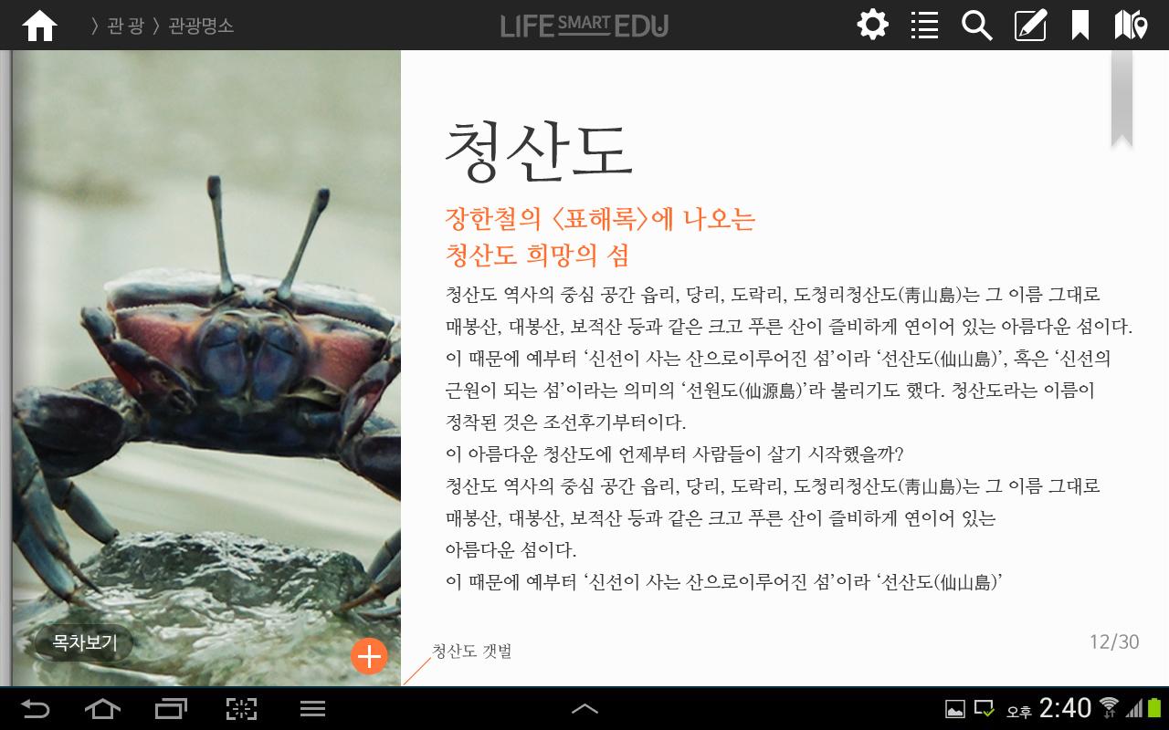 피아이씨티코리아 및 애니모비에서 개발한 전남스마트라이프 앱 전자책입니다. 전라남도의 관광,여행,문화,생태를 타블릿에서 이용하도록 개발했습니다.