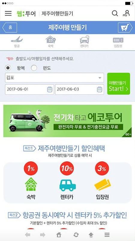 숙박 1% off, 렌터카 10% off, 15% off(항공권 포함시), 입장권 3% off