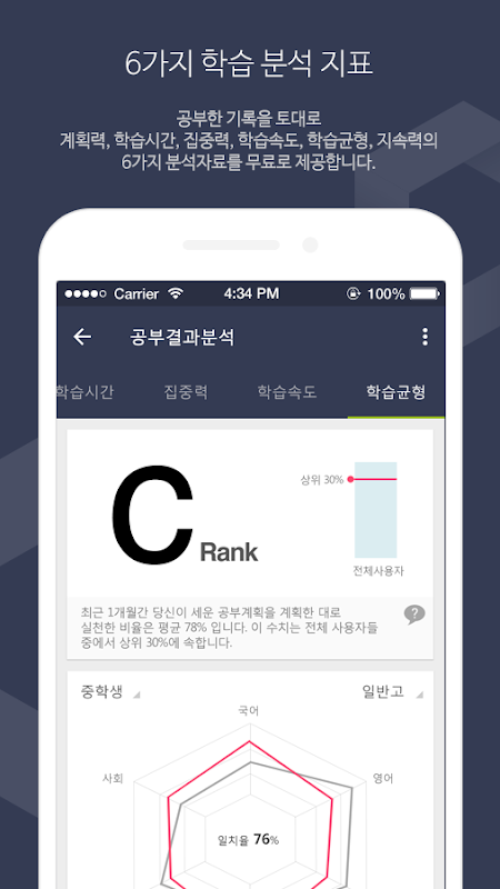 • 실행한 학습을 과학적으로 분석해주는 에듀큐브만의 6가지 학습지표 리포트 (계획력, 학습시간, 집중력, 학습속도, 학습균형, 지속력)