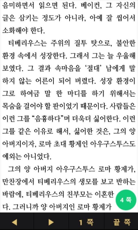◈ 이 앱북은 베이컨(17세기 영국철학자)의 『수상록』(에세이)에 인용되어 있는 티베리우스(고대 로마제국 2번째 황제)의 일화(숨을 거둘 때도 능청스러웠다는 내용 부분)를 읽고 생각난 것을 주관적으로 정리한 앱북입니다.