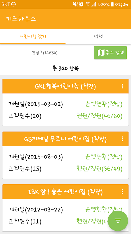 우측 하단의 필터 버튼으로 어린이집명, 정원, 운영상태에 대하여 필터링할 수 있습니다.