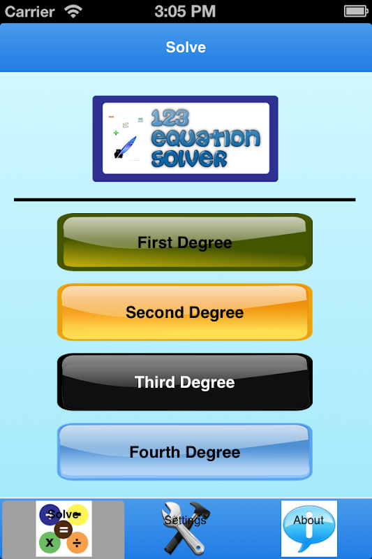 Application for calculate the results for equations of first, second, third and fourth degrees. In this application is needed internet connection for show equations formatted. You can choose the variable that you you (eg. x, y, z, …), the type of degrees (eg. deg, grad and rad) and the number of accuracy decimal (eg. 1…9). You can use trigonometric and logarithmic functions. This application is supported the following languages: portuguese, spanish, french and english.