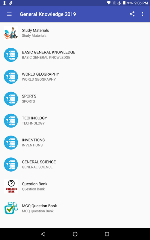Ứng dụng ngoại tuyến Kiến thức chung (GK) 2019 cung cấp cho bạn quyền truy cập vào các câu hỏi theo các danh mục khác nhau với các cập nhật thường xuyên. GK hoạt động hoàn toàn ngoại tuyến để giúp bạn dễ dàng đọc nó mọi lúc mọi nơi.
