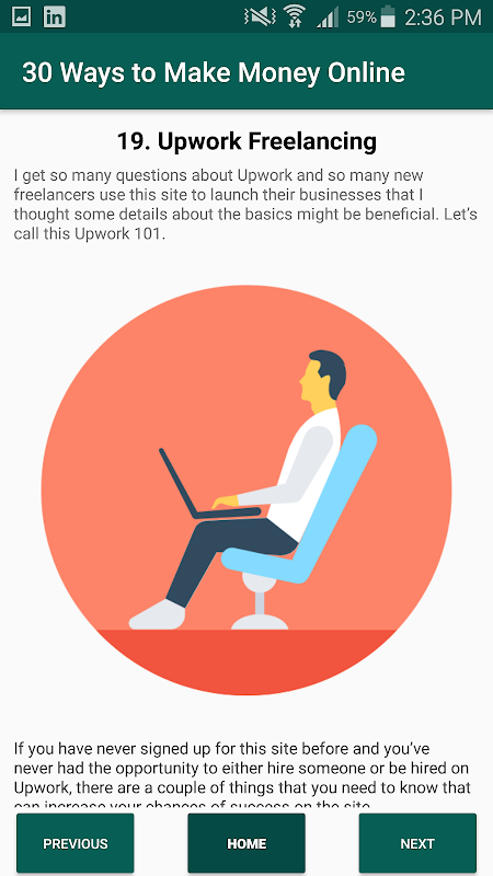 Hầu hết các phương pháp được đưa ra trong ứng dụng này cần những kỹ năng rất ít; Tuy nhiên, những cách tương đối khó khăn để kiếm tiền trực tuyến có hướng dẫn hoàn chỉnh cho học tập.