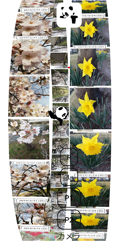 - 軽いタッチで画面をスクロール(上下動)させ立体的回転させて写真をみることができます。