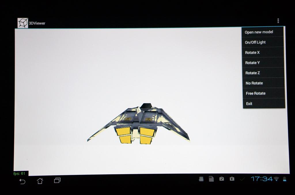 Da menu è possibile ruotare sui tre assi l'oggetto e abilitare/disabilitare la luce, con lo zoom di android si può scalare l'oggetto.