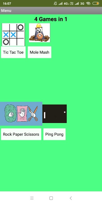 This application can be used to play four games: TicTacToe, Mole Mash, RockPaperScissors and PingPong.