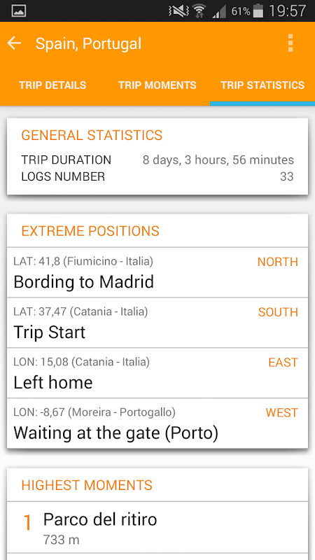 Stores all your position's info such as latitude, longitude, speed and altitude and make you organise all your moments in trips so you can always "re live" an holiday, a walk with your friends or the details of your business trip, see statistics, share them with your friends and see how far from home you have been!