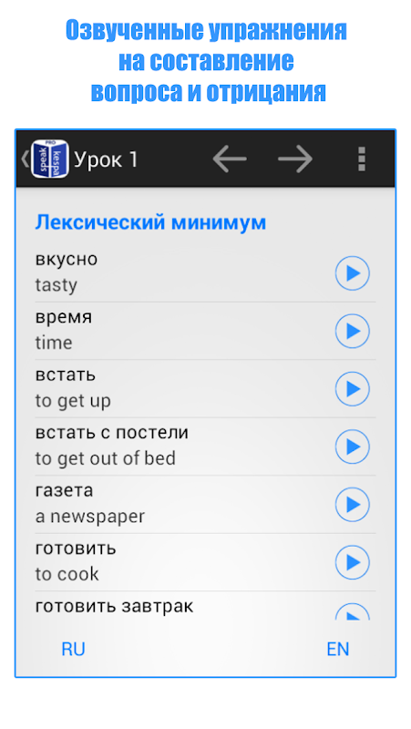 Все слова и упражнения озвучены носителями языка в 2-х темпах речи: замедленном и естественном.