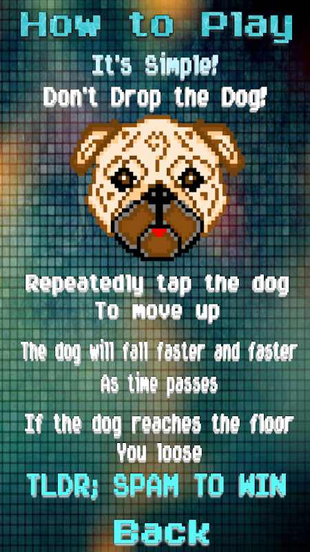 Don't let the 8 Bit dog run off screen by tapping repeatedly. As time passes the dog will run faster. The more you tap, the more you score in this addicting free game!