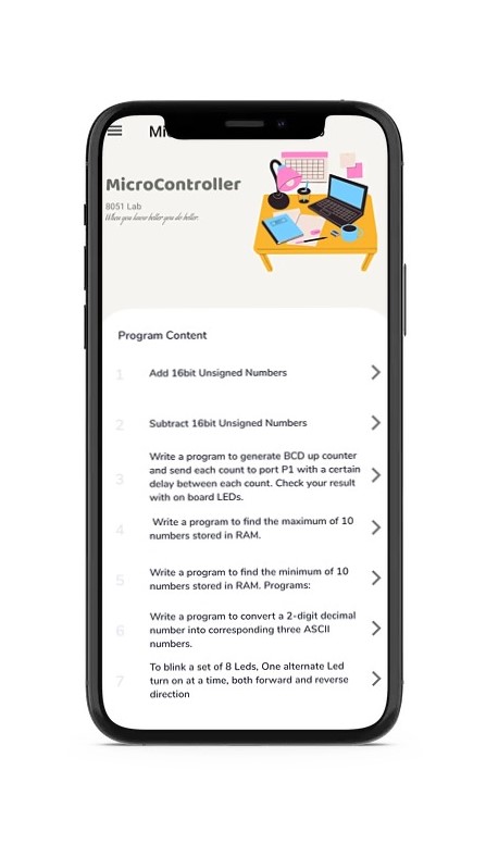 Ứng dụng này có chứa 19 chương trình Lab ứng dụng cơ bản cho 8.051 vi điều khiển và một chút về lý thuyết. Ứng dụng này chắc chắn sẽ tiết kiệm thời gian của bạn trong khi viết hồ sơ. Các mã trong ứng dụng này đã sẵn sàng để nướng.