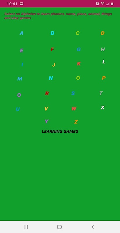 Abc phonics đặt tên cho động vật những thứ và trò chơi là một ứng dụng dạy ngữ âm và bảng chữ cái miễn phí, giúp học tập vui vẻ cho trẻ em, từ trẻ mới biết đi cho đến trẻ mẫu giáo và trẻ mẫu giáo. Nó có một loạt các tên để giúp trẻ em nhận ra tên chữ cái, liên kết chúng với âm thanh và đưa kiến thức bảng chữ cái của chúng để sử dụng trong các bài tập học tên vui nhộn. Bất kỳ trẻ mới biết đi có thể học tiếng Anh và bảng chữ cái tiếng Anh và tên từ bảng chữ cái đơn giản. Trẻ mới biết đi tập trung vào việc đọc và học bảng chữ cái, rút các lệnh menu ra khỏi ngón tay di chuyển. Ứng dụng giáo dục thân thiện với trẻ em