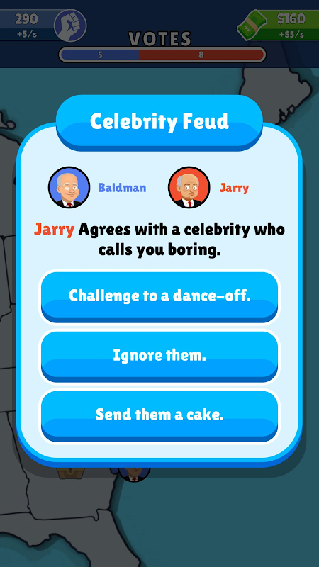 Bạn đã sẵn sàng để trở thành ứng cử viên tổng thống tiếp theo chưa? Trong trò chơi chiến lược chính trị ly kỳ này, con đường đến với chức vụ cao nhất đất nước nằm trong tay bạn. Xây dựng và duy trì mối quan hệ tốt với hàng xóm để đảm bảo phiếu bầu của họ hoặc sử dụng quyền lực và sự giàu có của bạn để tác động đến quyết định của họ. Mọi lựa chọn bạn đưa ra đều sẽ tác động đến chiến dịch của bạn, từ việc quản lý nguồn lực của bạn đến việc tạo ra các liên minh quan trọng. Bạn sẽ vươn lên nắm quyền thông qua ngoại giao và thiện chí, hay bạn sẽ thống trị bối cảnh chính trị bằng ảnh hưởng và sự xảo quyệt của mình? Con đường đến với chức tổng thống đầy rẫy những thách thức.