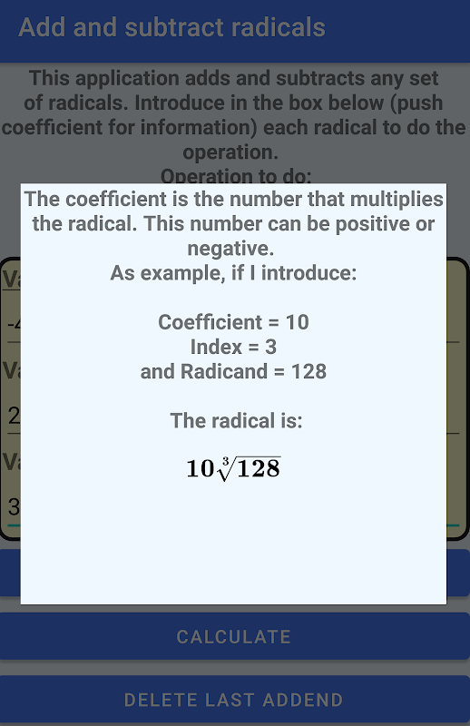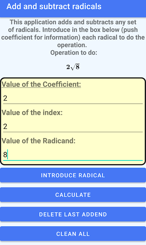 The user can introduce the radicals through a form. In this form, the user will choose the coefficient (number that multiplies to the radical), the index and the radicand of the radical.