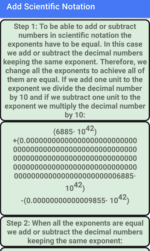 Khi người dùng giới thiệu các số, ứng dụng sẽ thực hiện các thao tác. Để cộng hoặc trừ các số trong ký hiệu khoa học, tất cả các số phải có cùng số mũ. Do đó, chúng tôi thay đổi các con số để