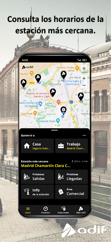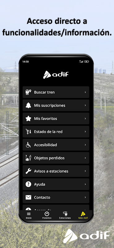 Adif trên điện thoại di động của bạn cho phép bạn xem tình hình của các chuyến tàu chở khách (lịch trình và tuyến đến hoặc đi thực tế) và các dịch vụ của các trạm hành khách (khu vực thương mại, dịch vụ khách hàng, khả năng tiếp cận, ...) được quản lý bởi Quản trị viên cơ sở hạ tầng đường sắt (Adif).