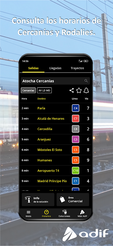 Adif trên điện thoại di động của bạn cung cấp cho bạn thông tin cập nhật và thời gian thực về: