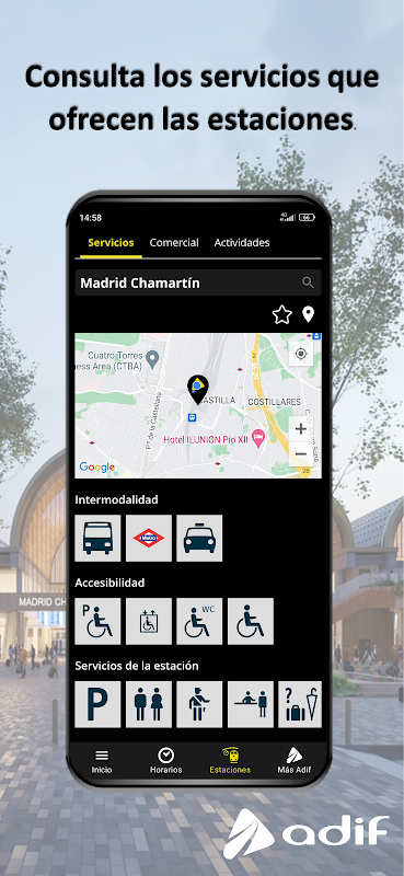 Adif trên điện thoại di động của bạn cũng bao gồm thông tin chung, dịch vụ và các dịch vụ thương mại, văn hóa và giải trí từ các trạm hành khách. Cụ thể: