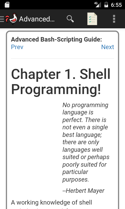 Advanced Bash Scripting Guide cung cấp mới bắt đầu với một giới thiệu đơn giản những điều cơ bản, và các chuyên gia sẽ tìm thấy chi tiết cao cấp mà họ cần.
