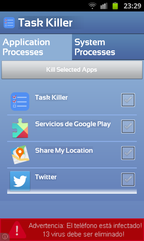 Advanced Task Clean Master is pretty simple. Open this tool and take a look at the running applications list. Check some apps you want to kill (don't kill Advanced Task Clean Master) or some system apps, tap the button 'Kill Selected Apps', Advanced Task Clean Master will kill all applications checked.