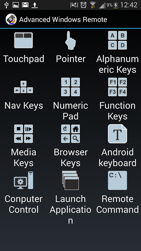 Advanced Windows Remote can be used to control the mouse pointer, to type characters either using the android keyboard or the built-in keyboard, to power-on (via wake-on-lan - WOL) or to power-off your computer and to launch arbitrary applications right from your android smartphone or tablet.