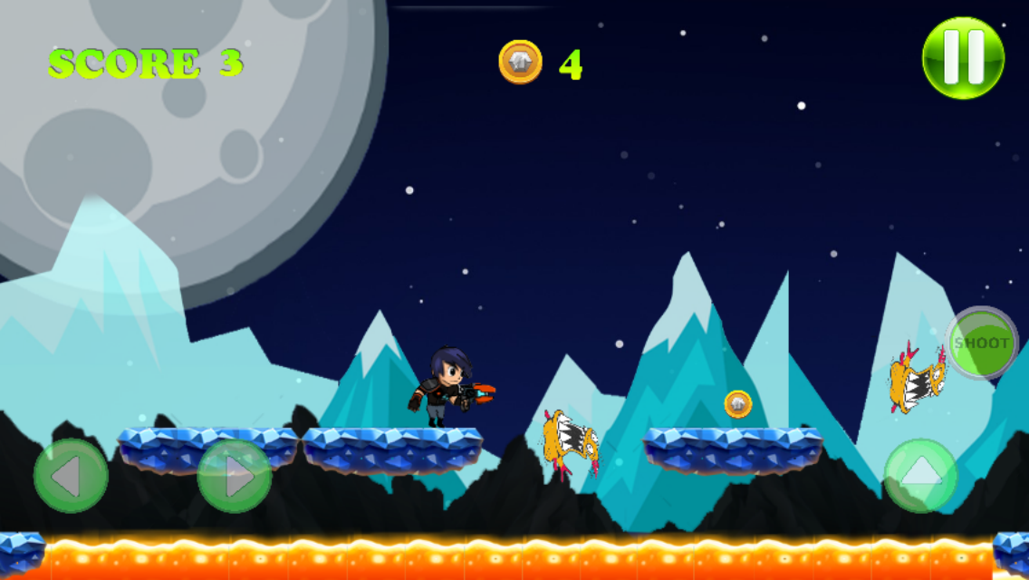 it contains four keys, one on the right and the other on the left ,SHOOT button to kill enemies to see go to the other side and the last to jump